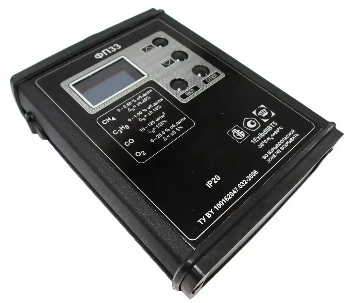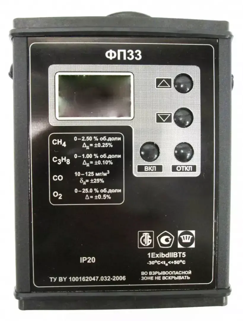 Газоанализатор ФП33 выполнен в прочном металлическом корпусе и представляет собой трёхкомпонентный (на 3 газа) взрывозащищённый портативный прибор с принудительным отбором пробы.