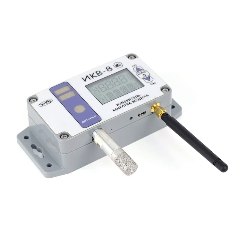 Измеритель ИКВ-8-Н выполнен в пластмассовом корпусе пылевлагозащищённого исполнения IP54. Оборудован ярким ЖК-экраном, удобными кнопками управления, имеет диффузионные окна для встроенных газовых сенсоров. В качестве ЧЭ в приборе используются электрохимические и оптические датчики. Датчики температуры и относительной влажности могут быть встроены в корпус или подсоединяться с помощью кабеля длиной 1 м. Электропитание измерительное устройство получает от внутреннего источника питания или сетевого адаптера.