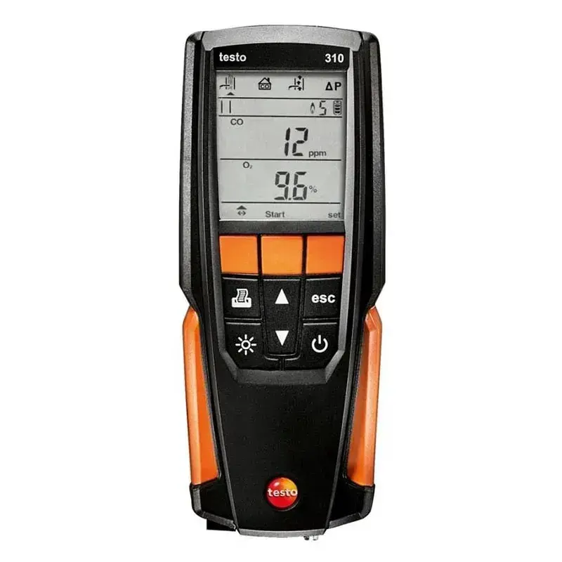 Газоанализатор Testo 310 оснащён сенсорами кислорода (O2), окиси углерода (CO), температуры и давления, что позволяет выполнять целый комплекс диагностических и сервисных операций. Основная задача прибора — определить концентрации O2 и CO в дымовых газах, а также измерить температуру дымовых газов и окружающей среды. Эти параметры крайне важны для оценки эффективности сгорания топлива, выявления утечек, неправильной настройки горелки или некорректной тяги.